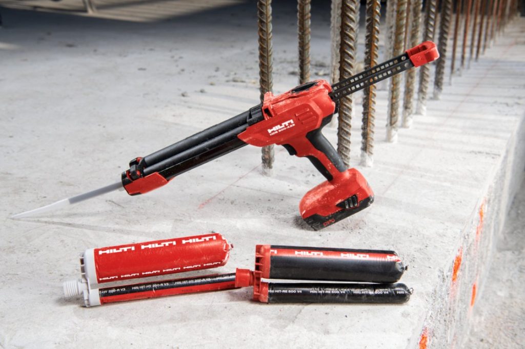 – Sử dụng súng bơm chuyên dụng để bơm một lượng keo cấy thép phù hợp vào lỗ.